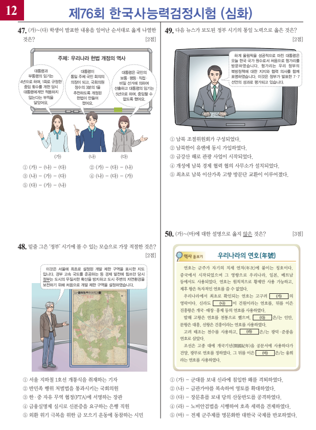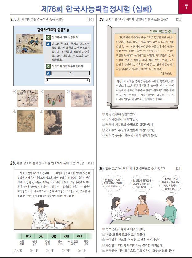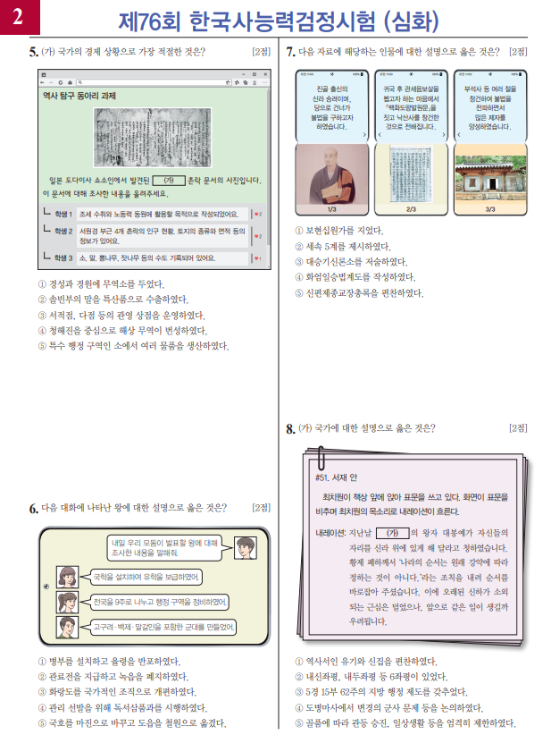 - 문화재·경제·사회·외교 관계 등을 묻는 문제도 출제되었고, 시대와 주제가 다양하게 섞여 있었습니다.