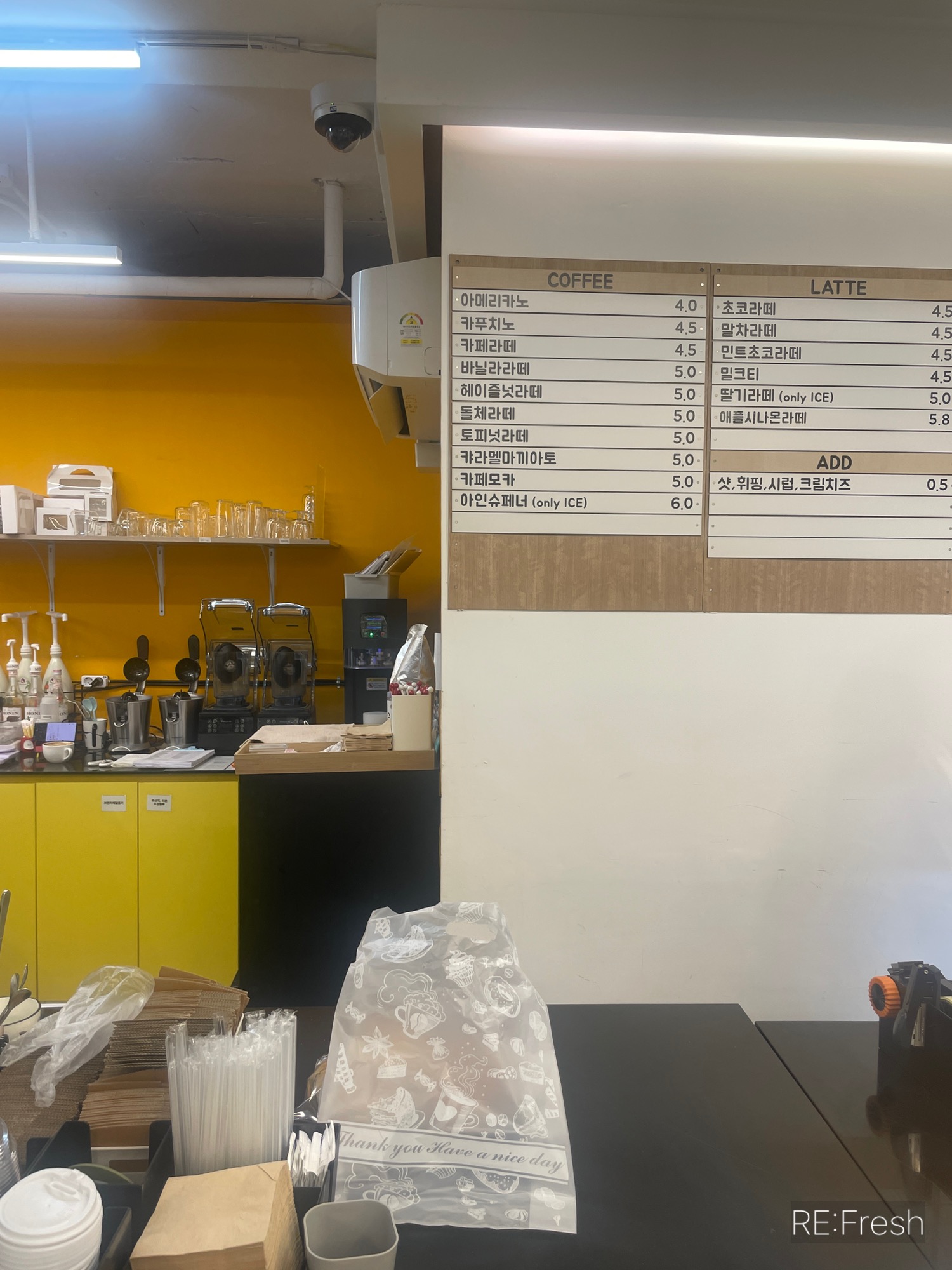 커피류는 아래 메뉴판에 나와있는 10가지 메뉴 중 고를 수 있어요. 요새 유행하는 최애 메뉴들로 구성이 되어 있네요. 로스팅카페 카피가 진하고 고소해서 달달구리 커피나 라떼에도 잘 어울릴 것 같았어요.